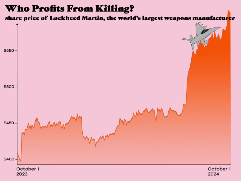 O gráfico acima das ações da Lockheed Martin, a maior produtora de armas do mundo e fabricante da aeronave F-35 (guarda esse nome), que Israel usa em seus bombardeios regulares a Gaza, obteve um retorno total de 54,86% no ano seguinte aos ataques de 7 de outubro de 2023, superando o S&P 500 em cerca de 18% ao fechamento do pregão em 4 de outubro deste ano, de acordo com a Responsible Statecraft.